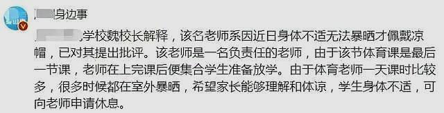 学校校长的寥寥几句话,一时间堵住了悠悠众口,一大部分网友开始设身处地地为体育老师着想,开始想到全天几乎都要在室外上体育课的老师,从体力上和日晒时间上要比学生长得多,老师身体不适之时戴顶凉帽,实在不应该被指责。