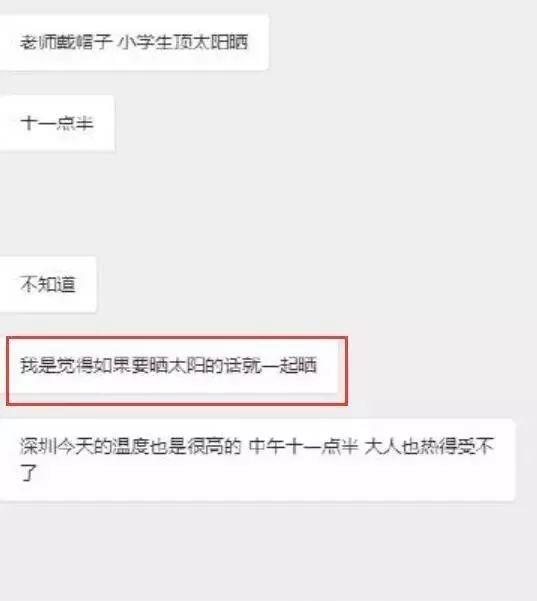 原来,该校当天最后一节课,11:00左右,体育老师带领孩子们在操场上活动,当时正逢中午,天气特别炎热,孩子们都光着头在阳光下暴晒着,而体育老师呢,却戴着一宽边“渔夫帽”,而这一幕正好被提前来校接孩子的家长看见,于是拍照怒斥,“凭什么?学生们被暴晒,体育老师就可以戴着帽子,要晒就一起晒。”